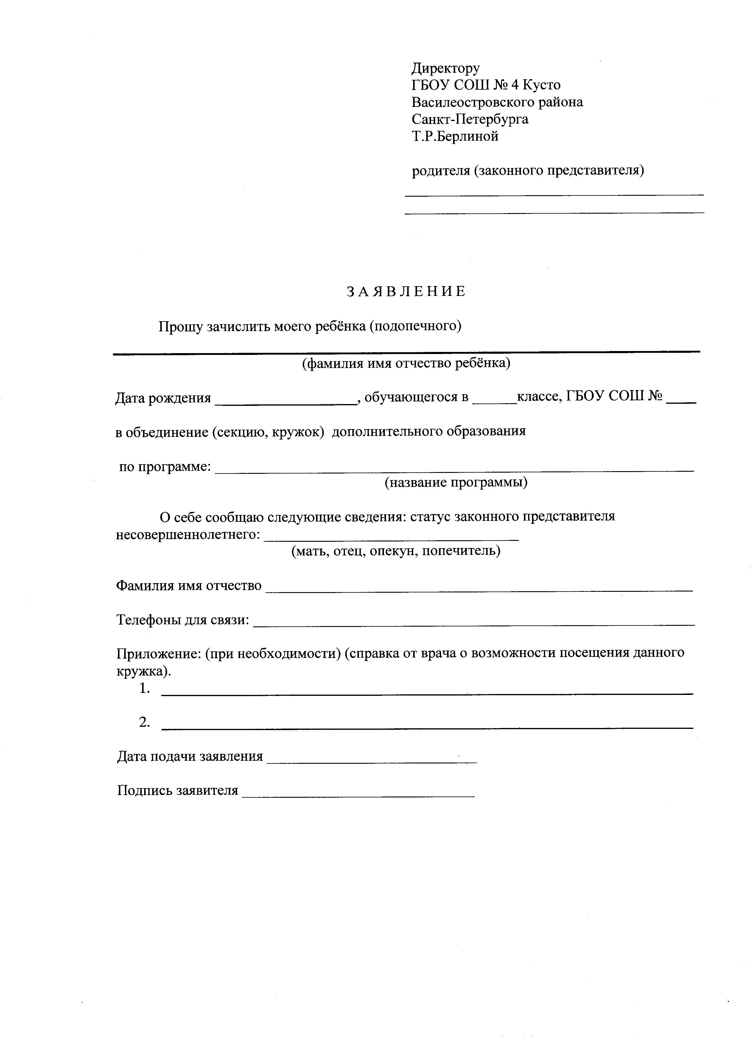 Заявление о зачислении в кружок