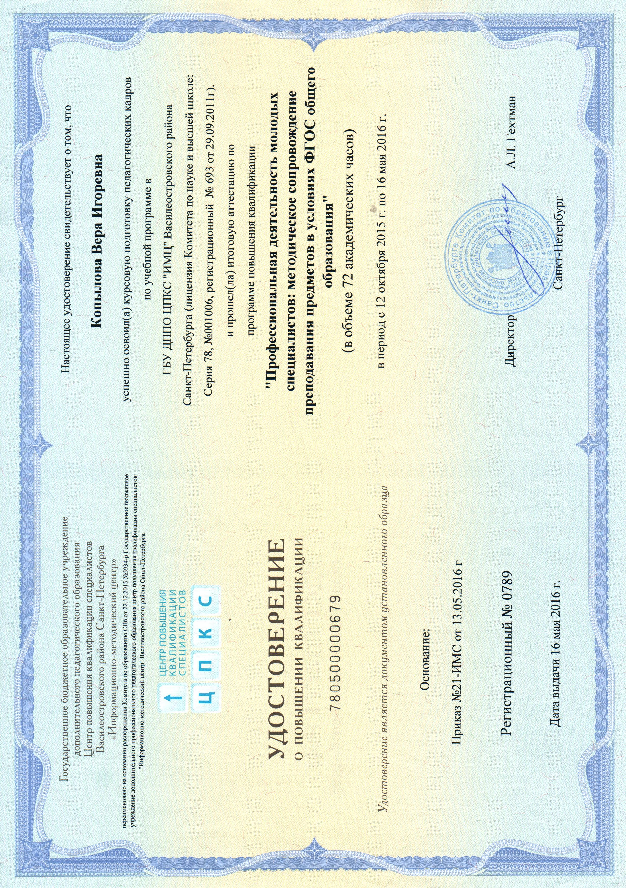 УДОСТОВЕРЕНИЕ О ПОВЫШЕНИИ КВАЛИФИКАЦИИ ФГОС
