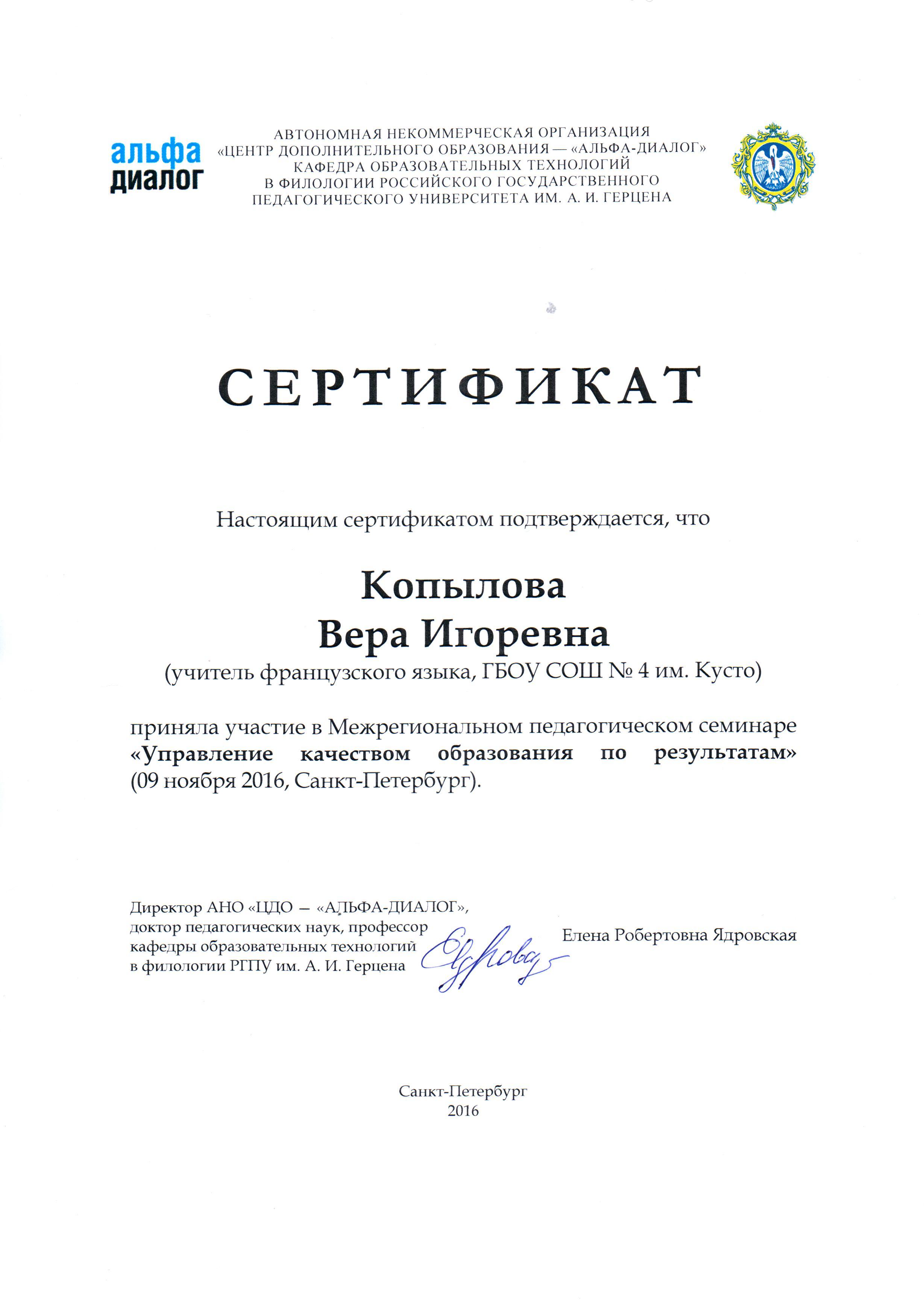 СЕРТИФИКАТ (СЕМИНАР "УПРАВЛЕНИЕ КАЧЕСТВОМ ОБРАЗОВАНИЯ")