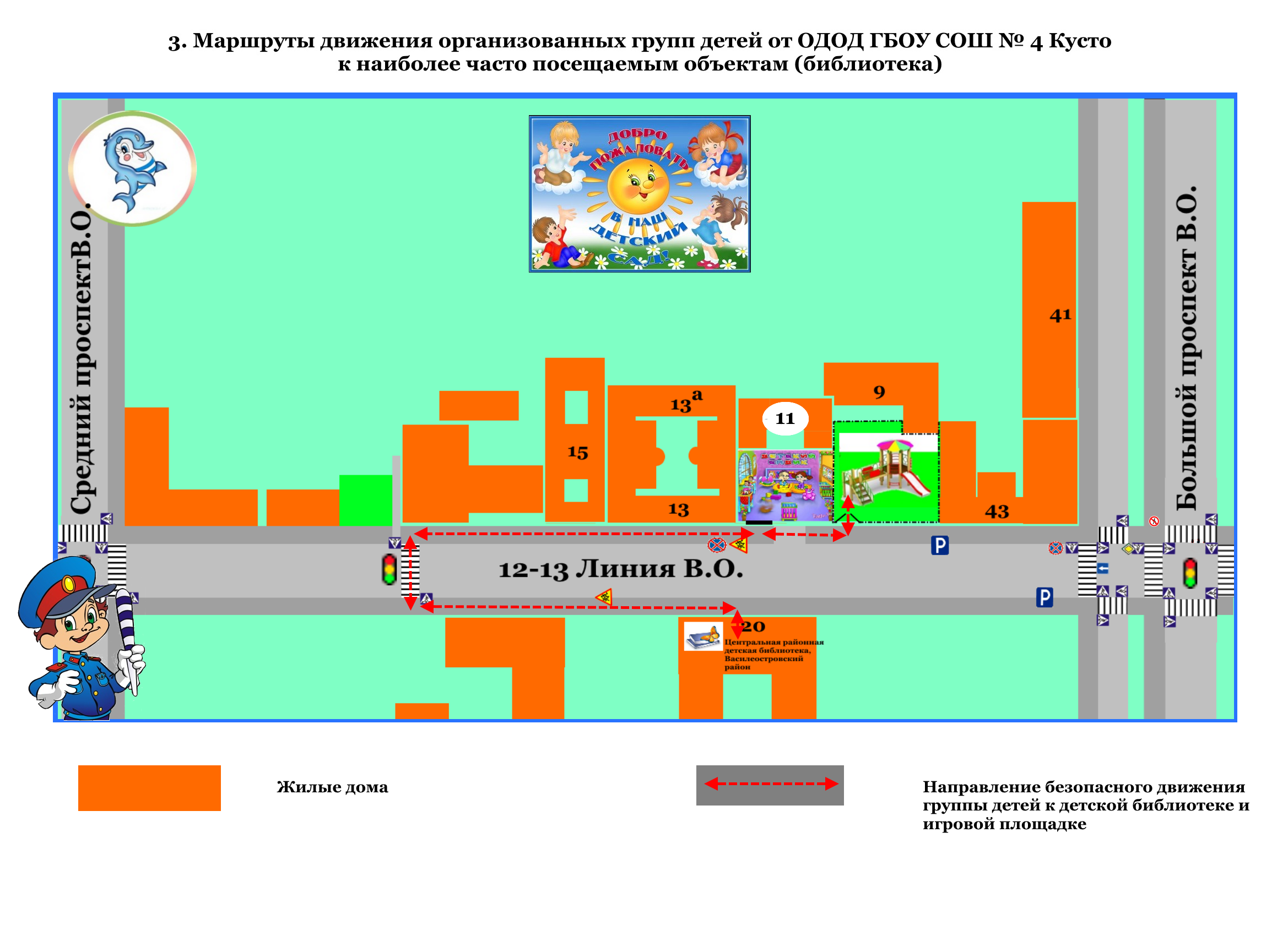 Маршруты движения организованных групп детей от ОДОД ГБОУ СОШ №4 Кусто к наиболее посещаемым местам (библиотека).
