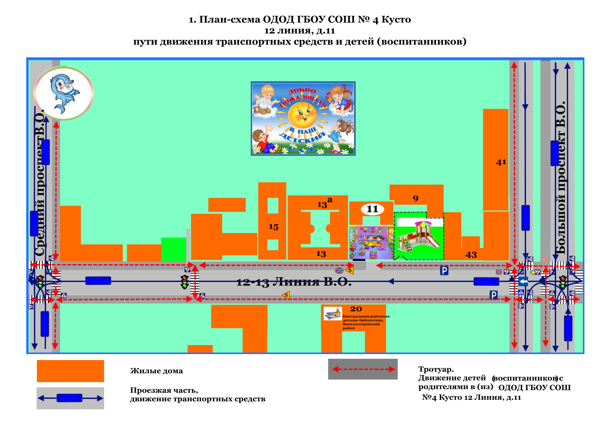 План-схема ОДО ГБОУ СОШ №4 Кусто 12 линия, д.11 пути движения транспортных средств и детей (воспитанников).